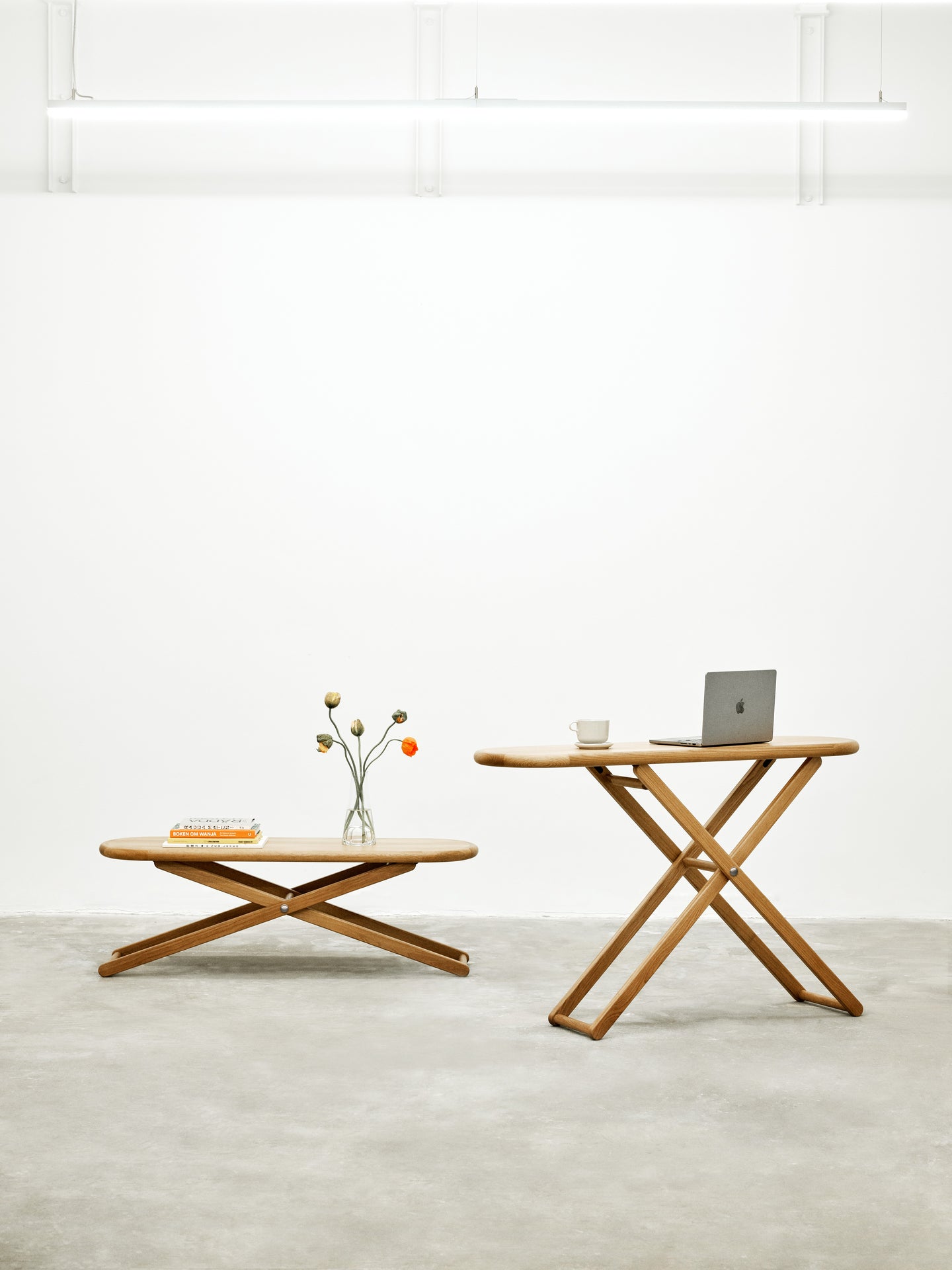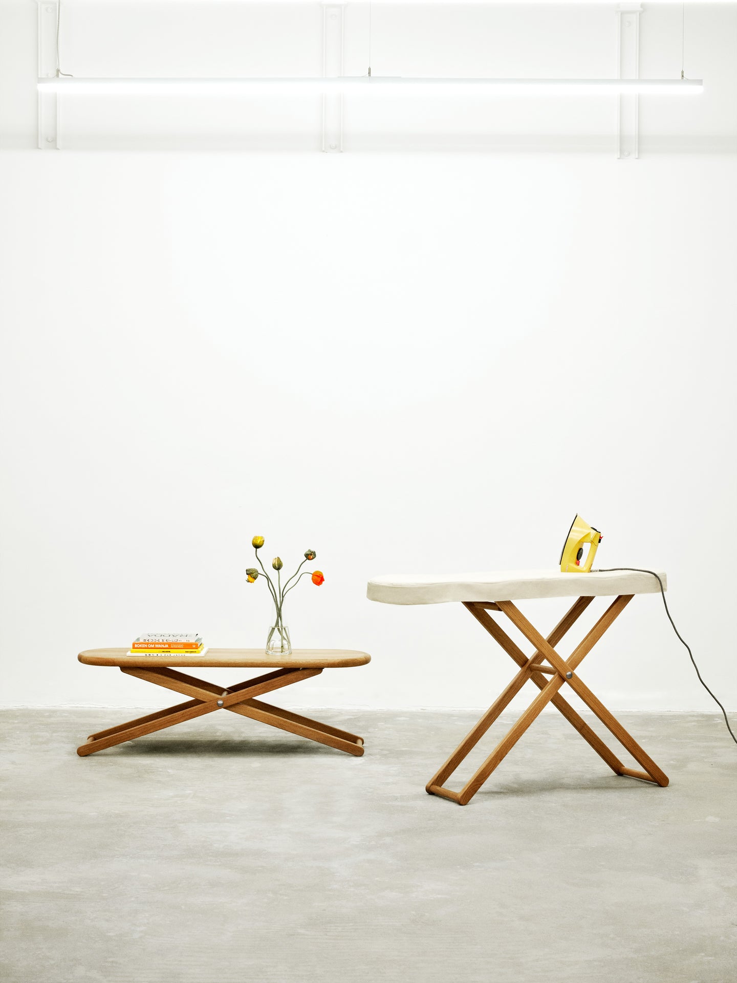 The ironing board of the closet transform into a flexible multi-use furniture piece, adjustable in four heights.