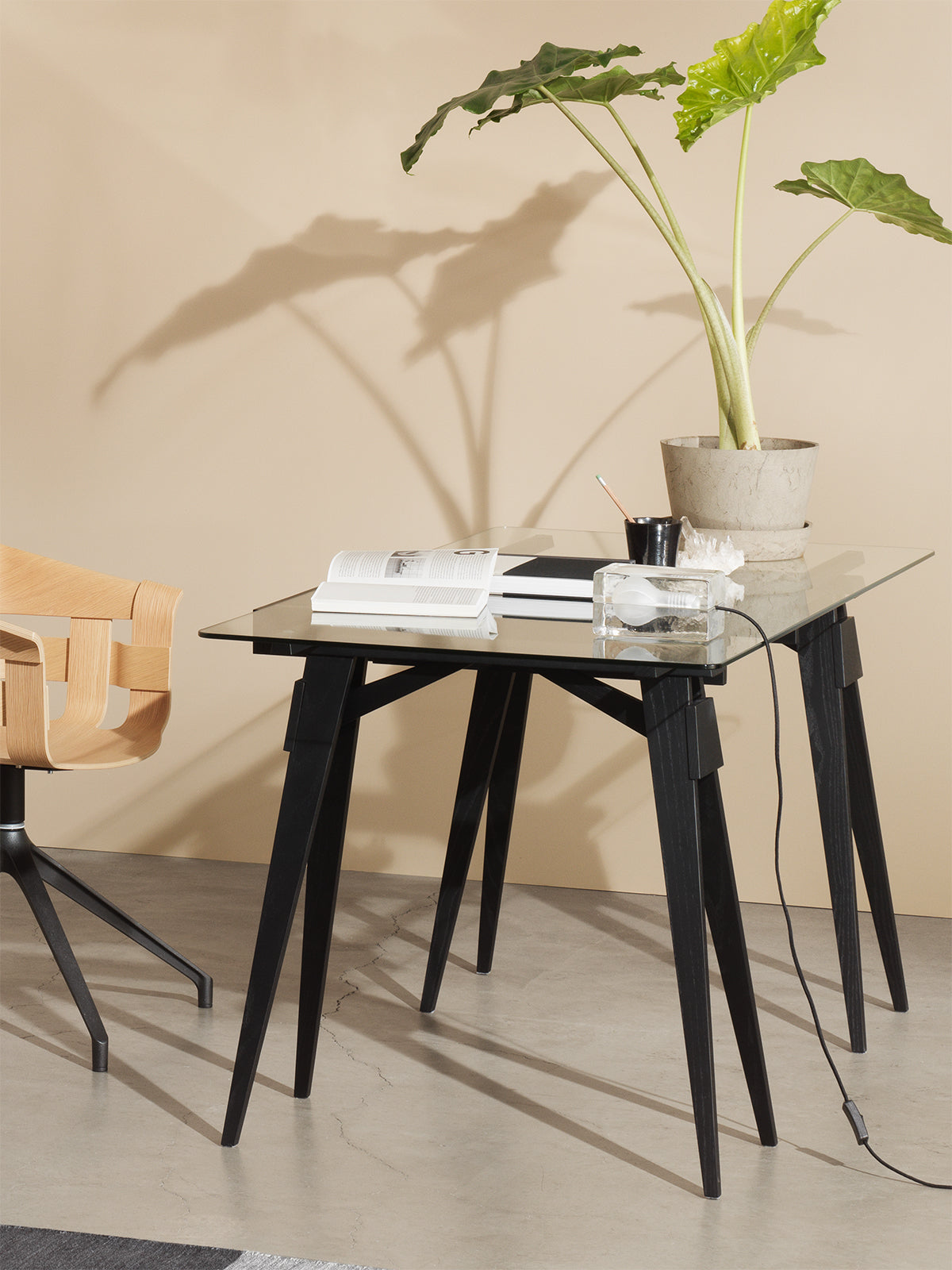- Trestle & Frame: Polyurethane lacquered solid oak. Glass Worktop: Tempered safety glass with round corners and chamfered edges.