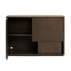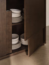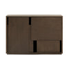 A minimalist yet unique expressive furniture piece that can stand alone or along a wall. A refined storage cabinet crafted with a distinctive design poetry. The exact form is underlined by the exposed grain of the oak veneer set in horisontal and vertical patterned shapes. The geometrically exposed slits does away with any handles