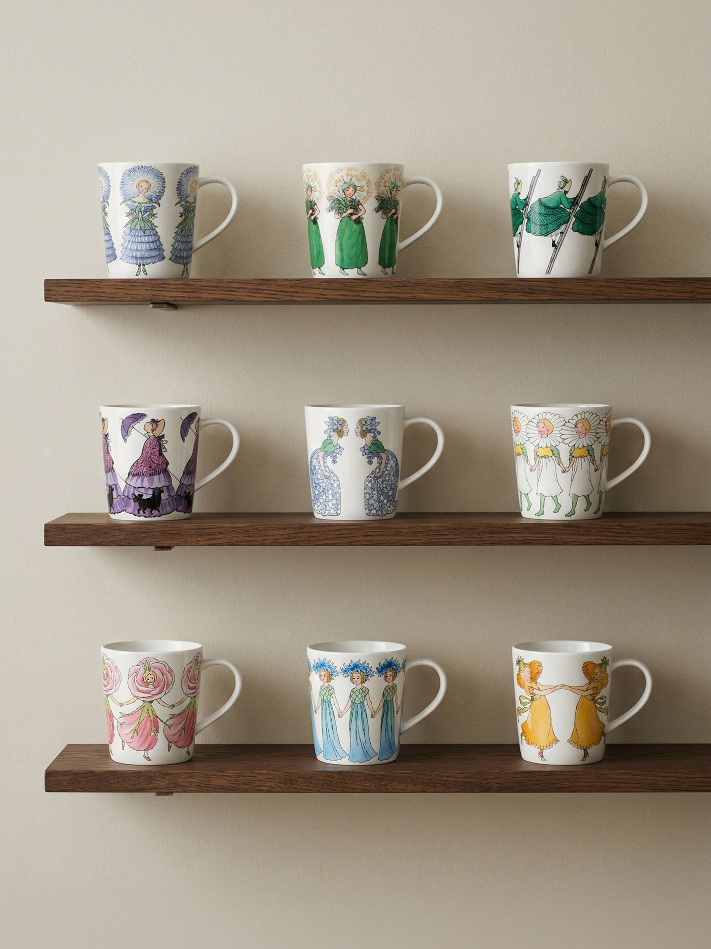 Mugs, Bowls and Trays with patterns based on illustrations by Elsa Beskow, interpreted by designer Catharina Kippel.
