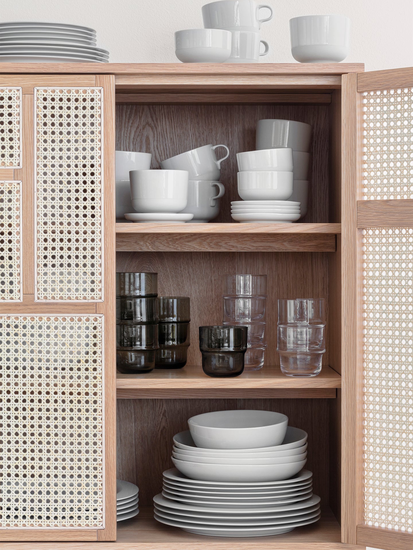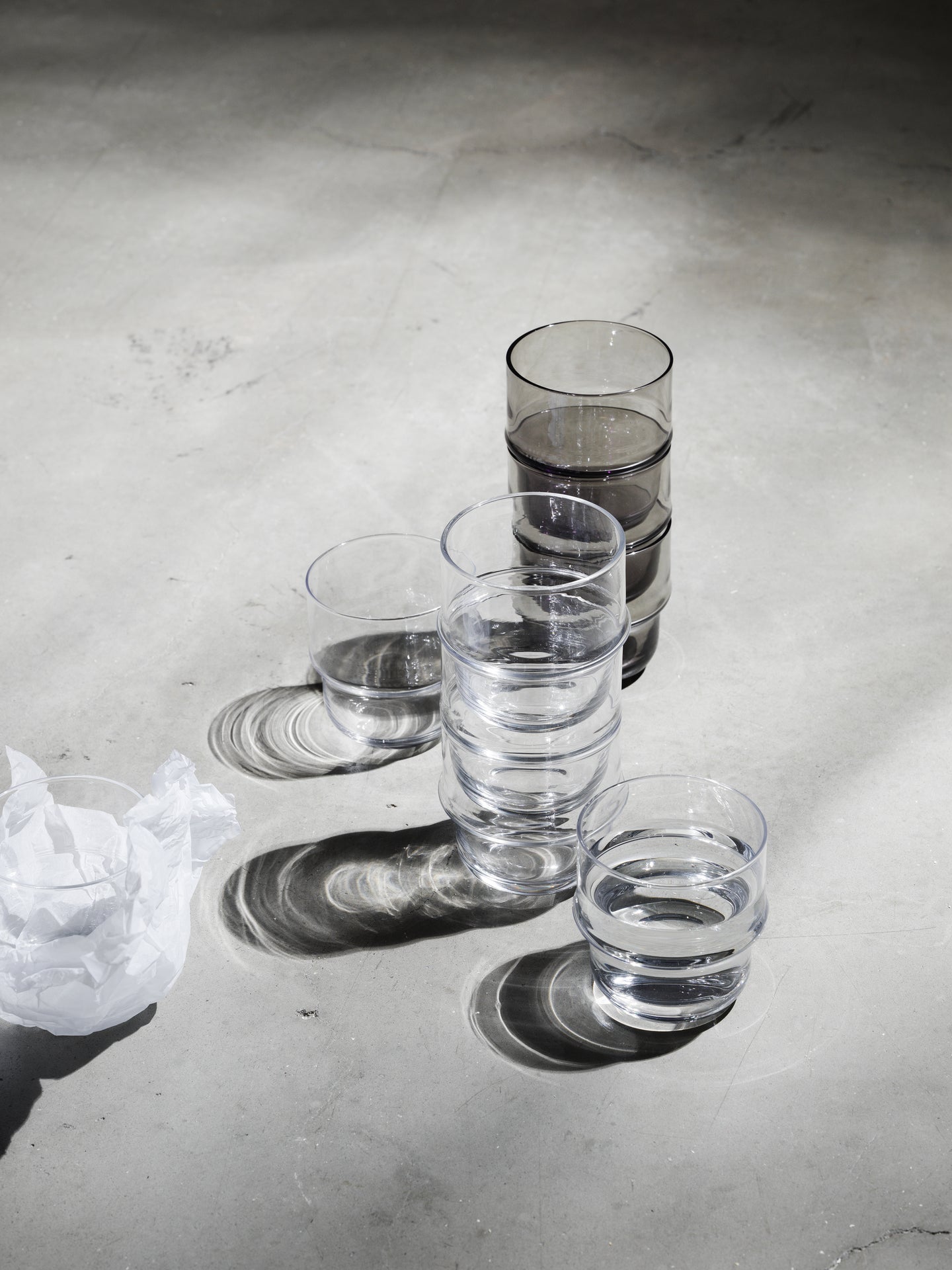 A wave in the glass catches the fingers and plays with the hand, while allowing practical stacking.